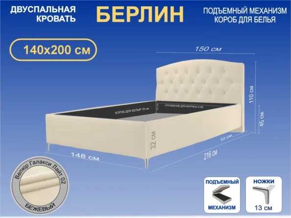 Кровать Берлин, 140×200, Подъемный механизм полное дно с полкой, Велюр Галакси лайт 02-бежевый, Ножки 13 см угловые хром Чехол на царгах НЕ съемный,.