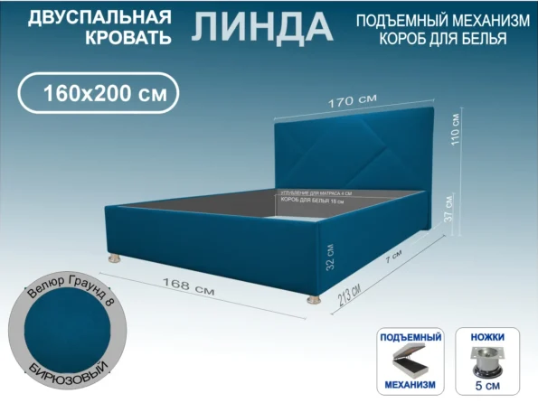В наличии Кровать Линда, 160×200, Подъемный механизм полное дно с полкой, Велюр Граунд 8-бирюзовый, Ножки 5 см стандарт.