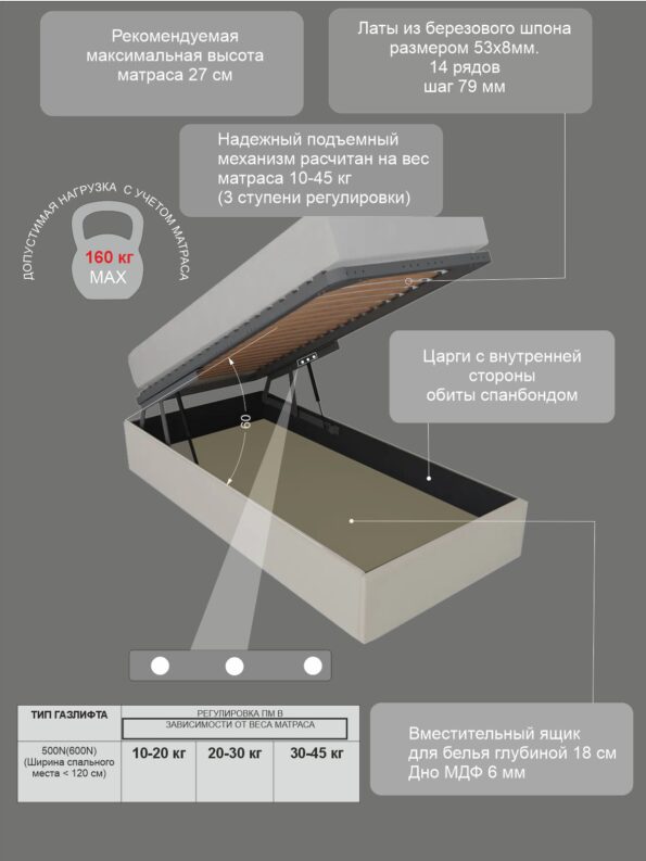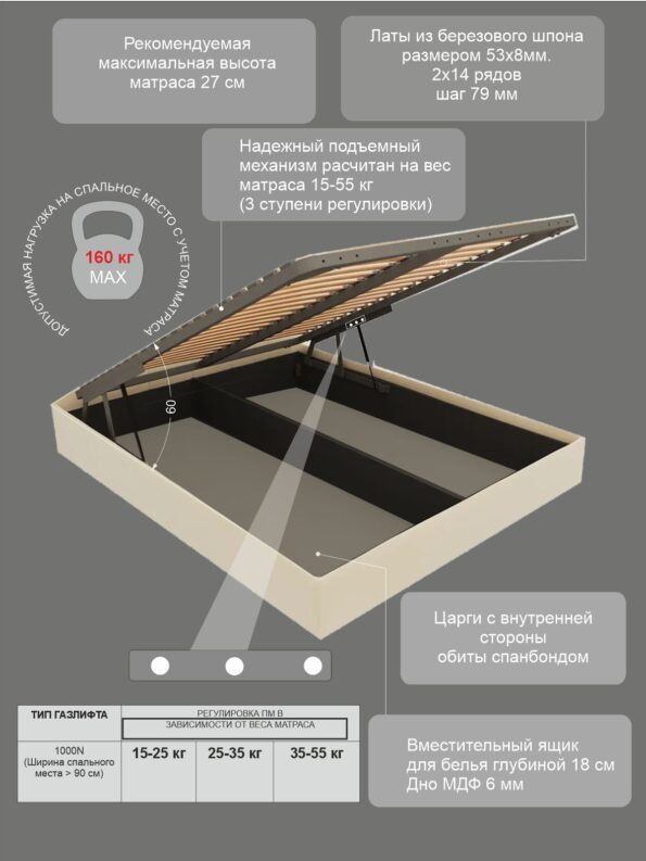 Высота изголовья 110 см., Болтовое крепление подъемного механизма.